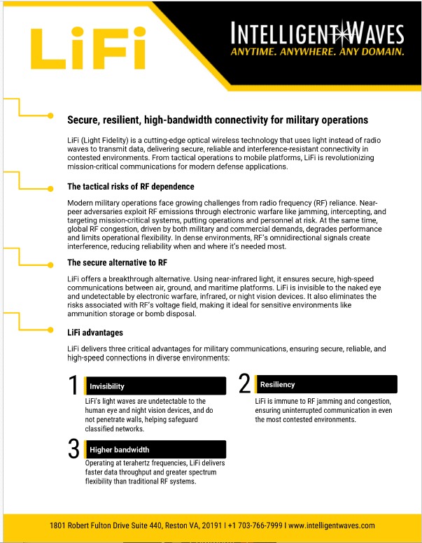 FSO and LiFi significantly increase the warfighter’s safety and capabilities and keep Commanders informed to accomplish the mission. Both FSO and LiFi are unsusceptible to data interception, jamming, and detection, while still providing superb data rate communications across the battlefield.
